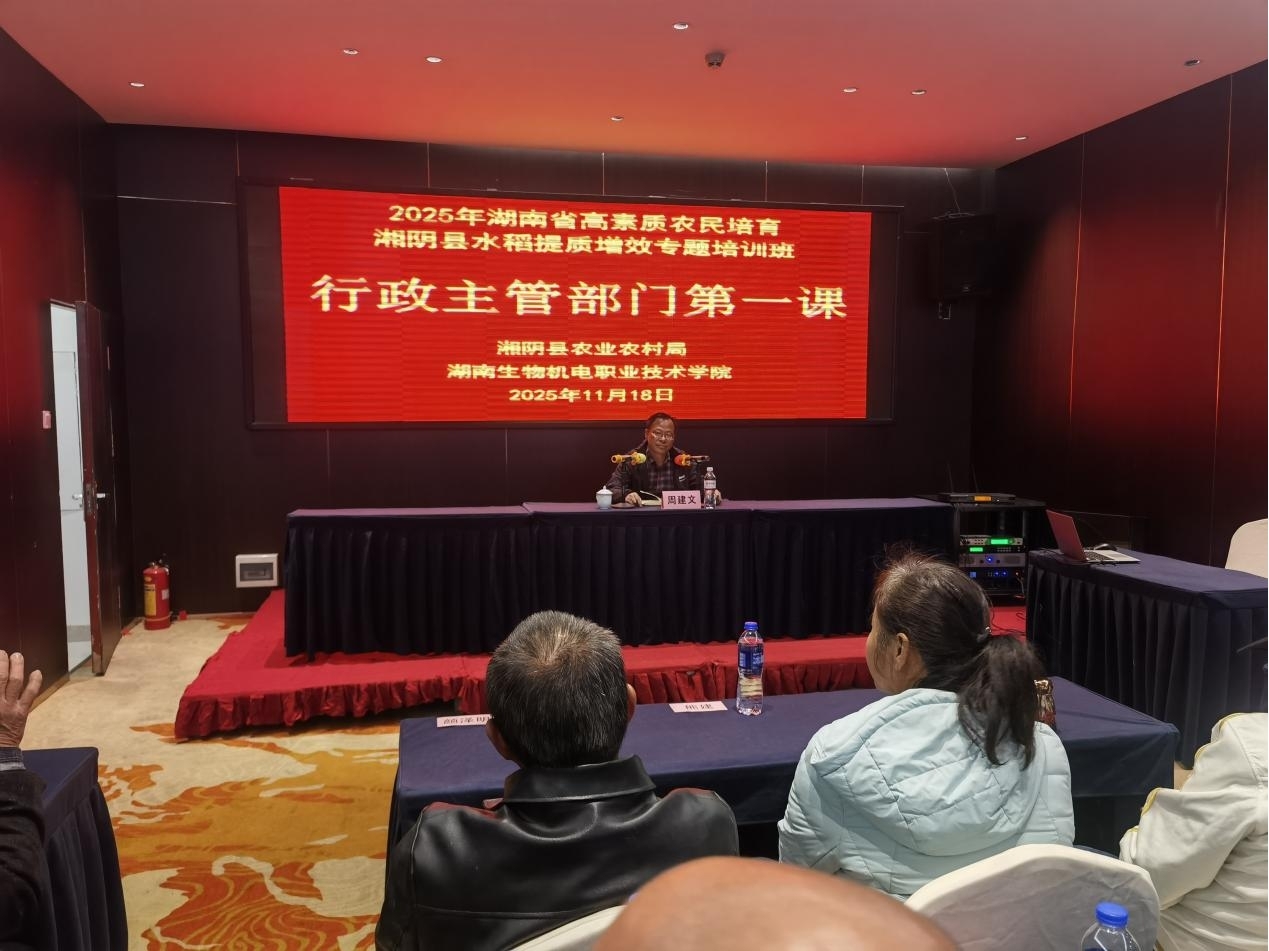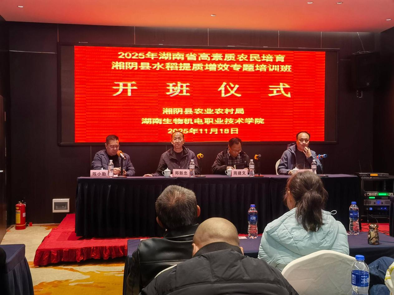 11月18日,由湖南省湘阴县农业农村局主办、湖南生物机电职业技术学院承办的2025年湖南省高素质农民培育湘阴县水稻提质增效培训班,在湖南生物机电职业技术学院培训基地正式开班。来自湘阴县的50名水稻种植主体参加培训,旨在通过系统学习与实践,培育一批“有文化、懂技术、善经营、会管理”的高素质农民,助力当地水稻产业提质增效与乡村振兴。