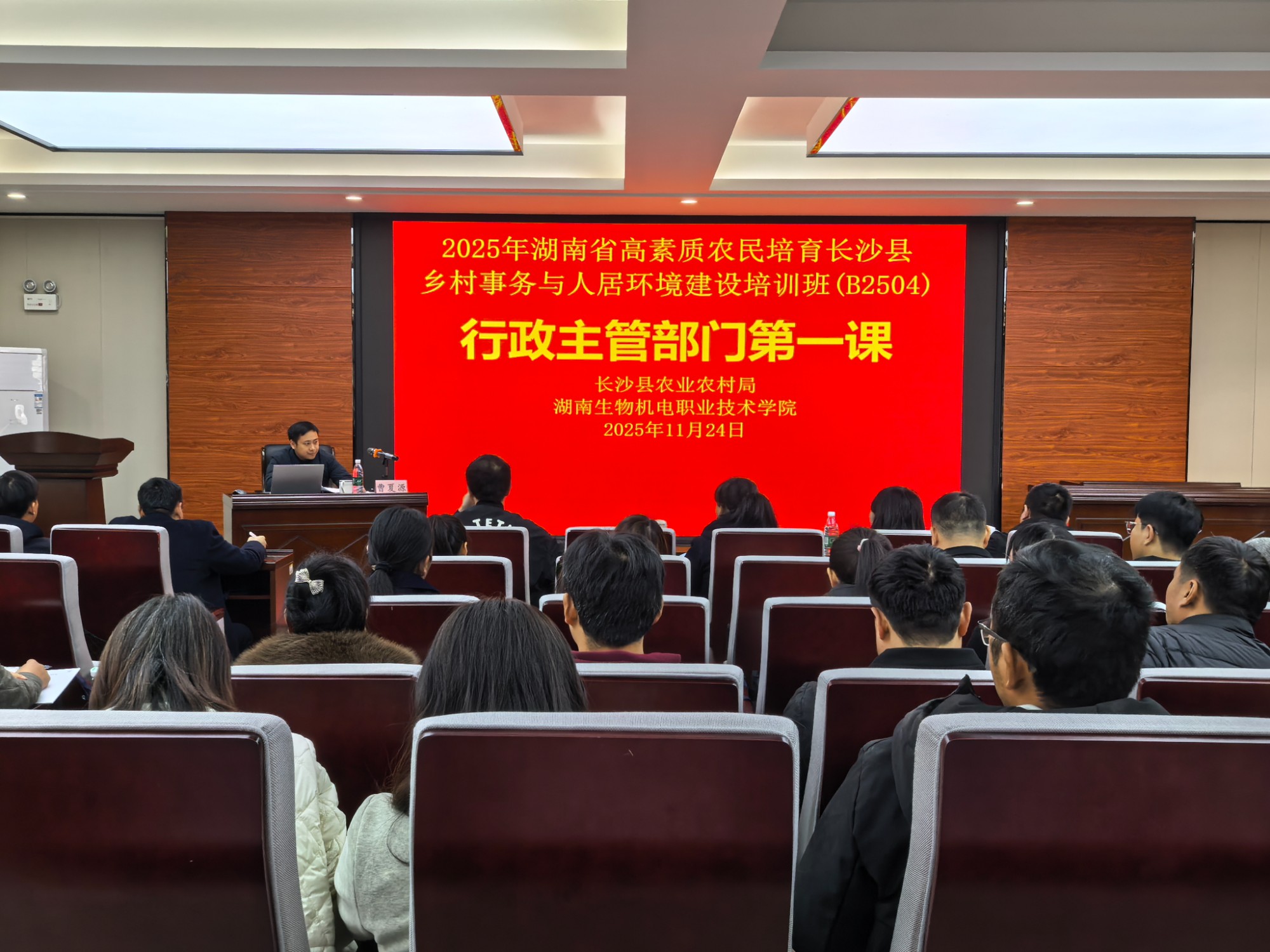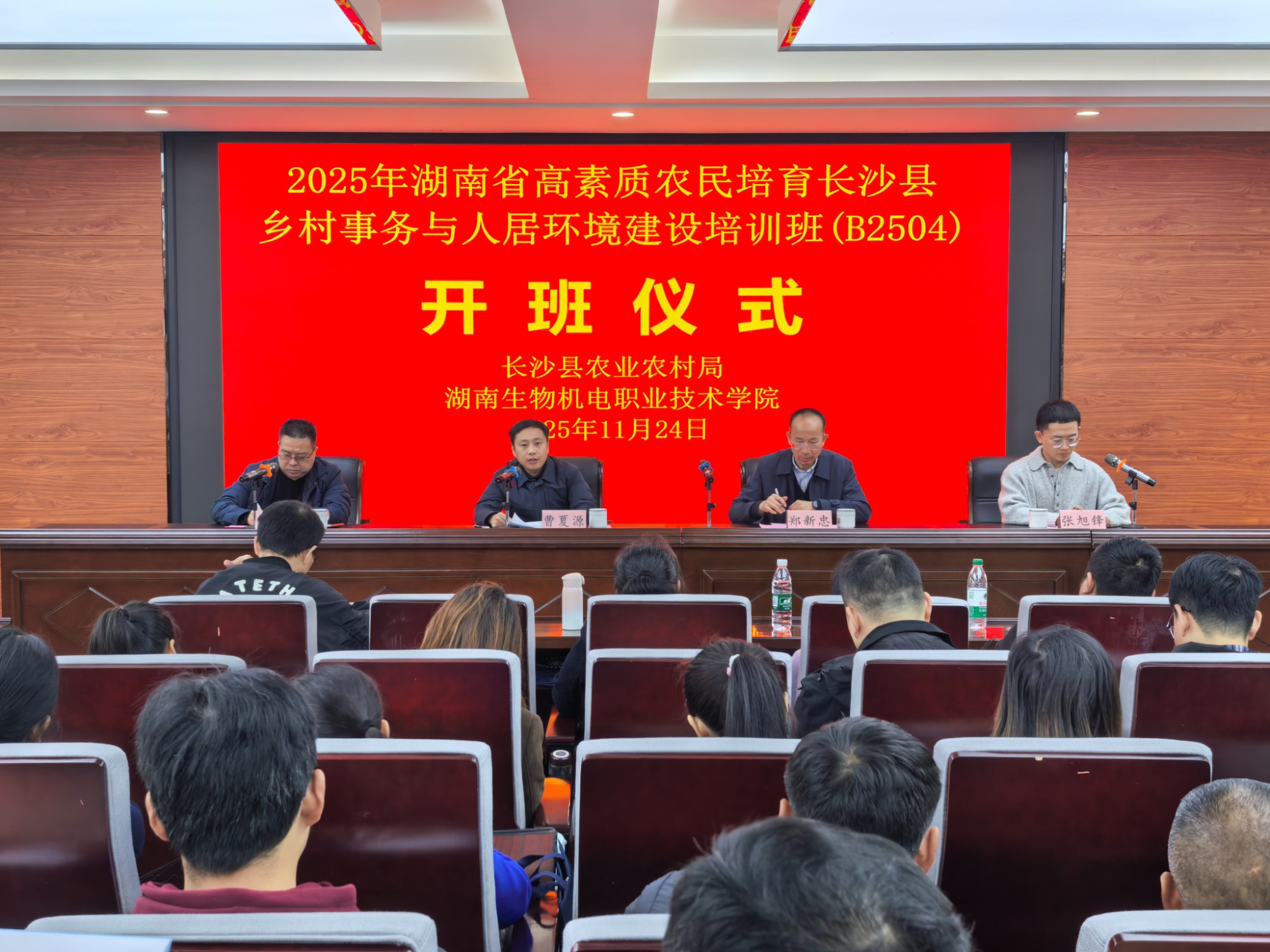 11月24日上午,由长沙县农业农村局主办、湖南生物机电职业技术学院承办的2025年湖南省高素质农民培育长沙县乡村事务与人居环境建设培训班(B2504)开班仪式在学校北山基地举行。本次培训吸引了来自长沙县各乡镇(街道)的50名村支两委青年干部、乡村治理骨干、网格保洁员等参加,旨在通过系统的学习和实践,提升全体学员的专业素养和管理能力,为长沙县农业的高质量发展贡献力量。